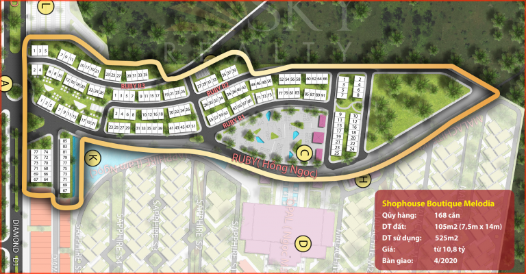 - Phân khu R1: Đường Ruby – View quảng trường