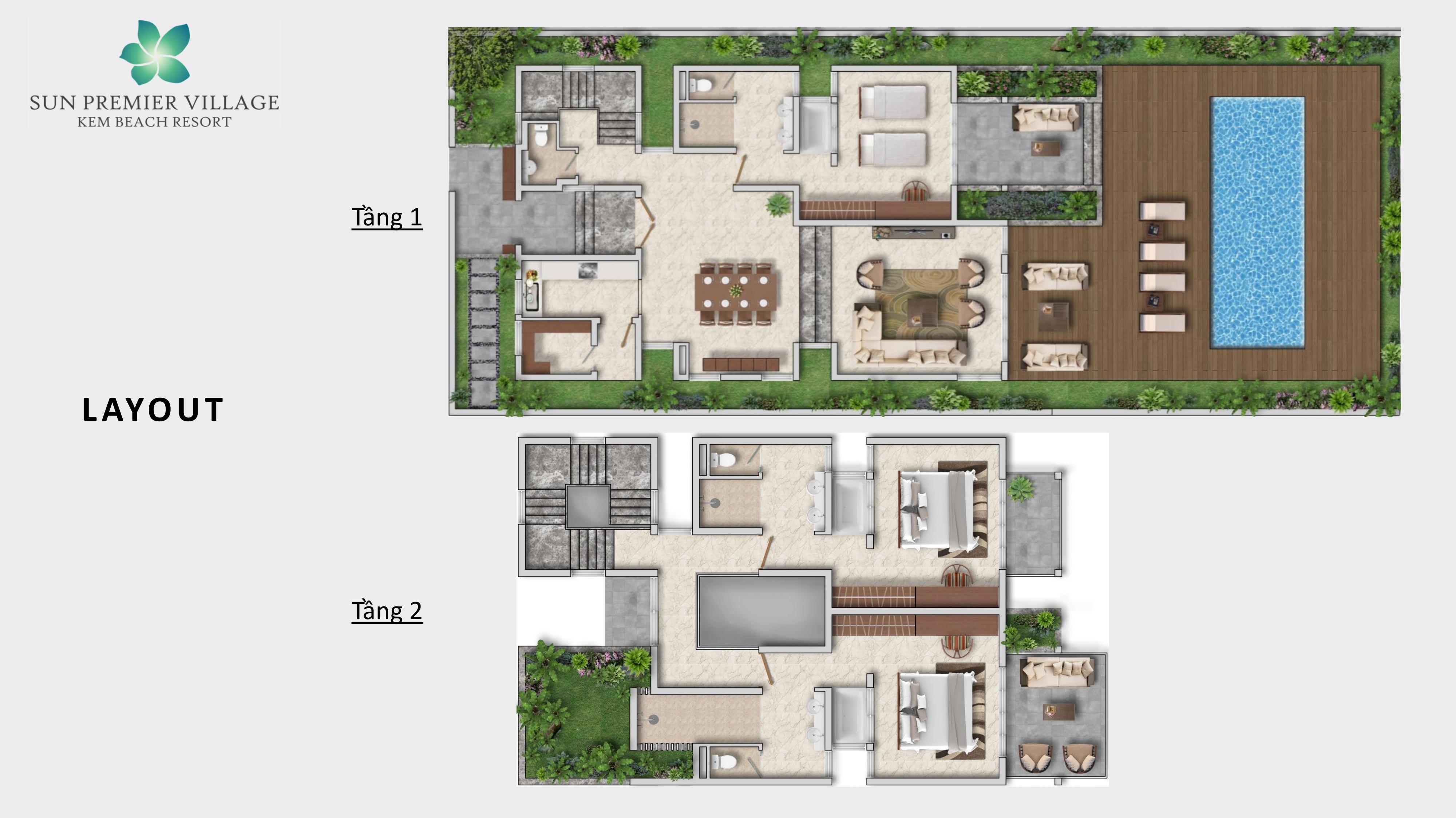 - Phân khu 1: Diện tích 360m2 – 880m2, 2 tầng, 3 -4 phòng ngủ, có bể bơi, hướng biển