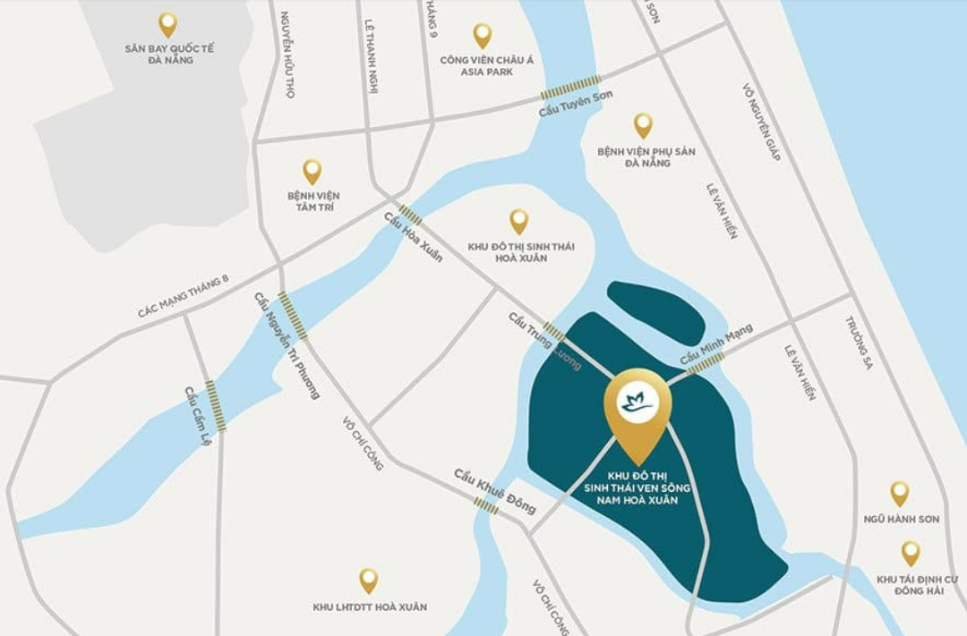 Vị Trí: Dự án Nam Hòa Xuân có vị trí tọa lạc cụ thể tại phường Hòa Quý, Ngũ Hành Sơn, Đà Nẵng với 4 mặt giáp sông, gần núi, gần biển.