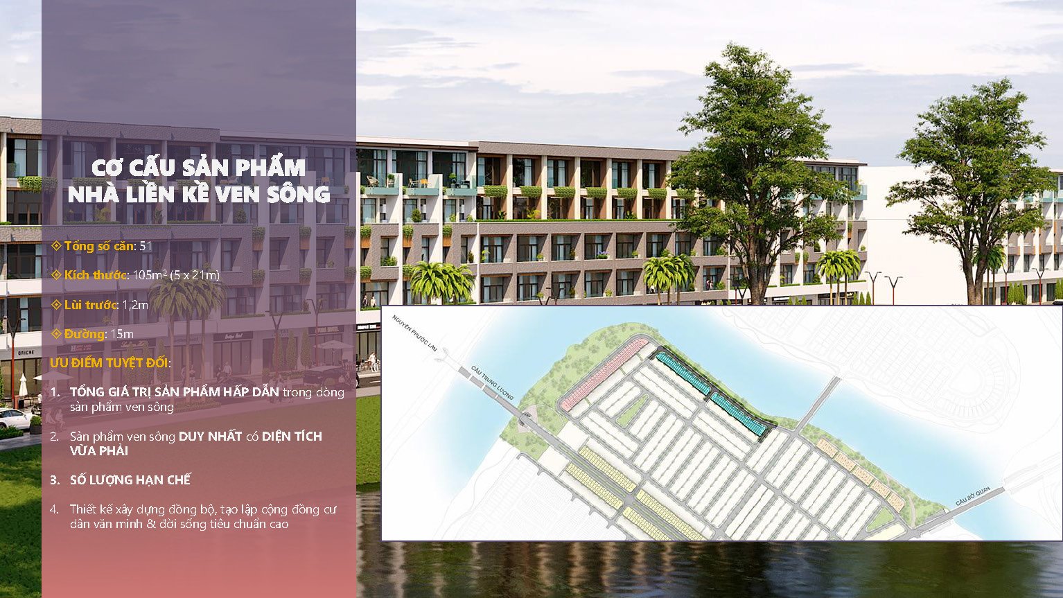 Đây là sản phẩm ven sông duy nhất có diện tích vừa phải. Các căn shophouse được hiết kế xây dựng đồng bộ, tạo lập cộng đồng cư dân văn minh & đời sống tiêu chuẩn cao.