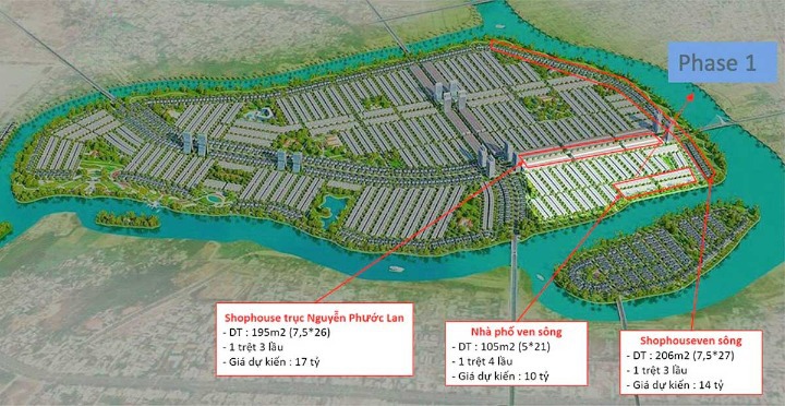 Giai đoạn 1 dự kiến sẽ có các loại hình nhà phố Shophouse trục Nguyễn Phước Lan, nhà phố ven sông và Shophouse ven sông.