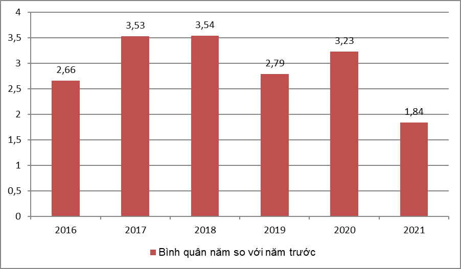 Chỉ số giá tiêu dùng (CPI) tăng 1,84% so với năm trước, đây là mức tăng thấp nhất kể từ năm 2016. Tốc độ tăng CPI bình quân các năm từ 2016-2021 so với năm trước lần lượt là: 2,66%; 3,53%; 3,54%; 2,79%; 3,23%; 1,84% .Nguyên nhân CPI bình quân năm 2021 tăng trong bối cảnh Covid diễn biến phức tạp